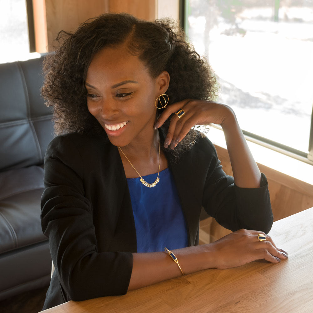 This Vermeil Gold wide squeeze release bangle bracelet features an emerald cut bezel set deep blue hydro glass rectangle.