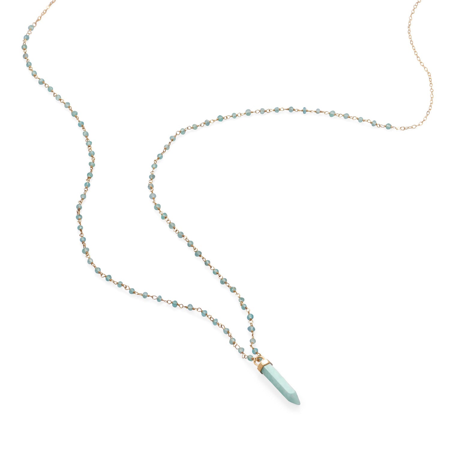 The gold-filled chain connected to a 14 karat gold plated sterling silver apatite chain with an amazonite pencil cut pendant.